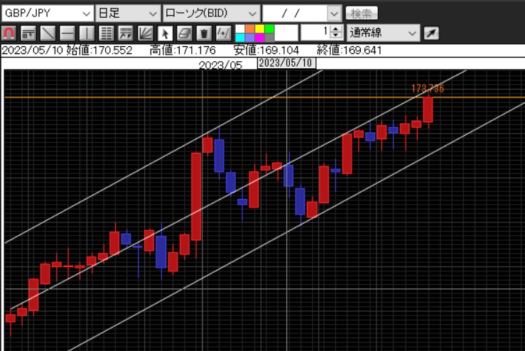 ・英小売売上高、米PCE、米債務上限問題の3つがポジティブに結果を出しているので次のはしご外しには気を付ける。6/2雇用統計発表前にポンド円が175.200円に到達した場合は一旦利確する。